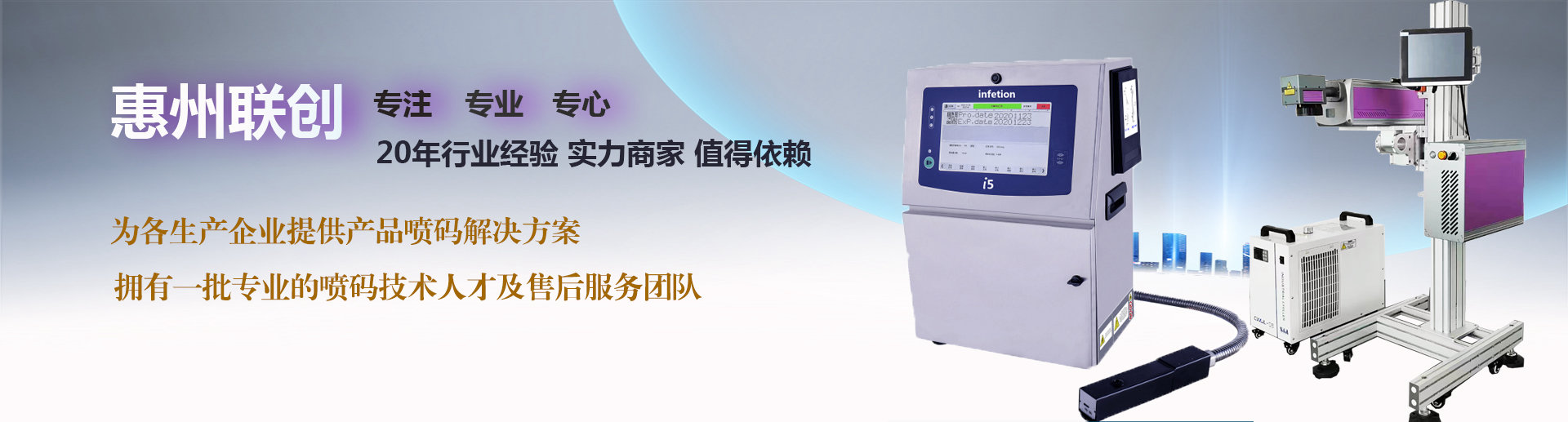 惠州联创包装设备有限公司是一家专业从事喷码机及相关设备的企业。成立于2004年,总部位于广东省惠州市。公司自成立以来一直致力于研发喷码机及标识方案,现拥有自主品牌英讯喷码机,同时代理国外品牌LINX喷码机、依玛士喷码机、EBS手持喷码机。